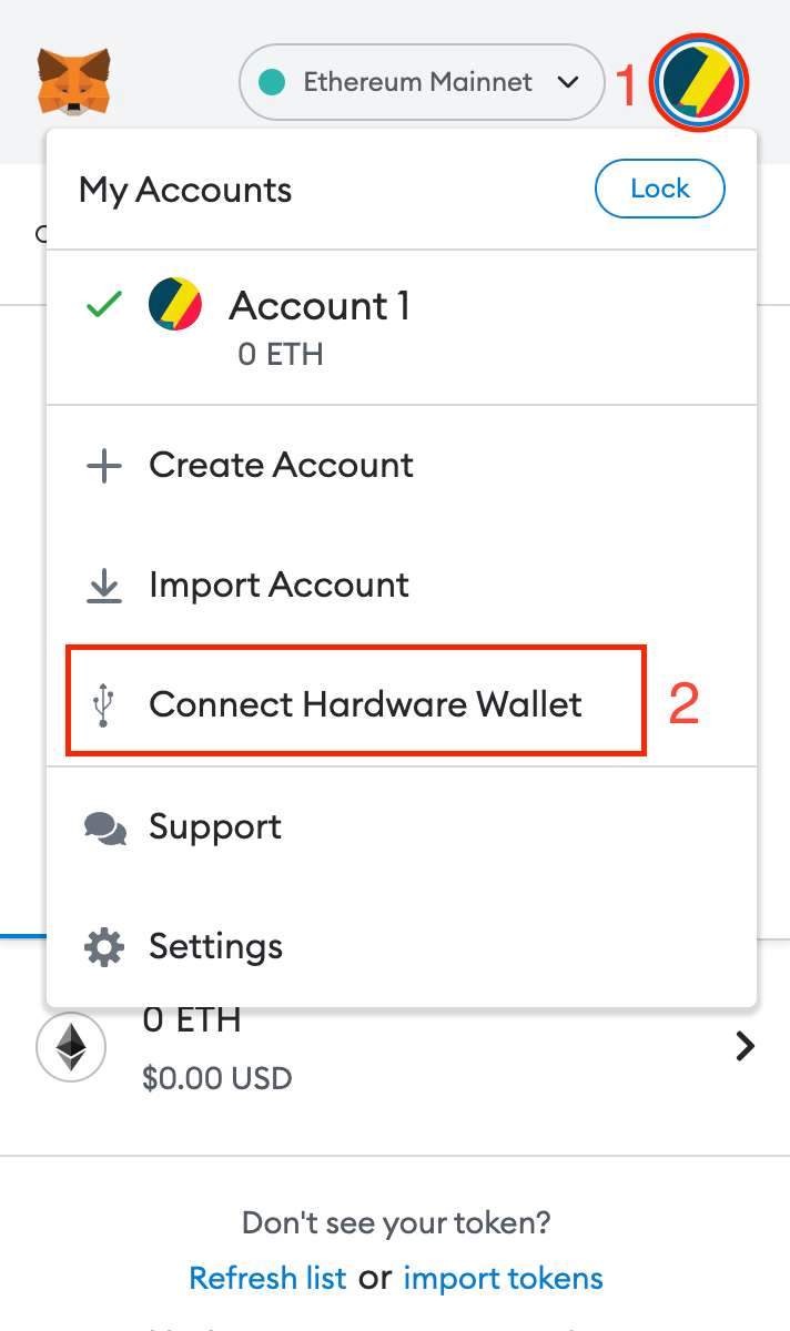 - Open Metamask, click on the circle on the right (1) to view your accounts or access the settings.