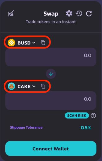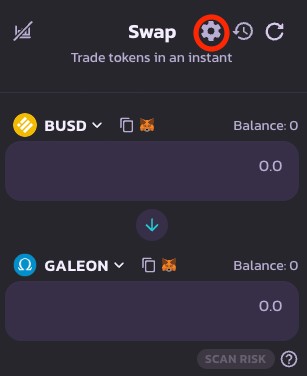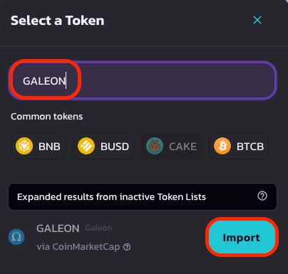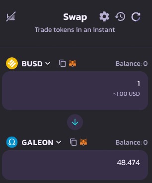 4. Sélectionnez les tokens que vous voulez échanger. Ici, nous allons acheter du $GALEON contre du $BUSD