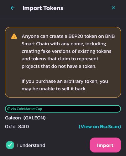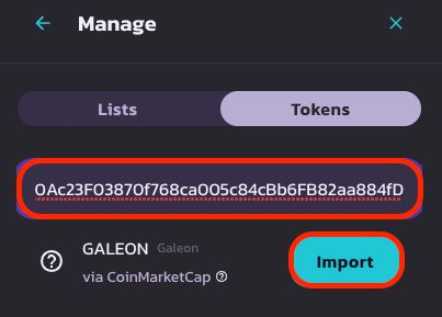 Importez le token $GALEON en recherchant le token ou en ajoutant manuellement son adresse : 0x1d0Ac23F03870f768ca005c84cBb6FB82aa884fD