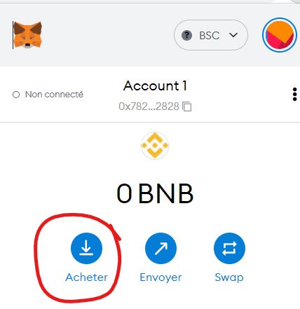Ou directement depuis metamask en appuyant sur le bouton "Acheter" sous votre solde de $BNB.